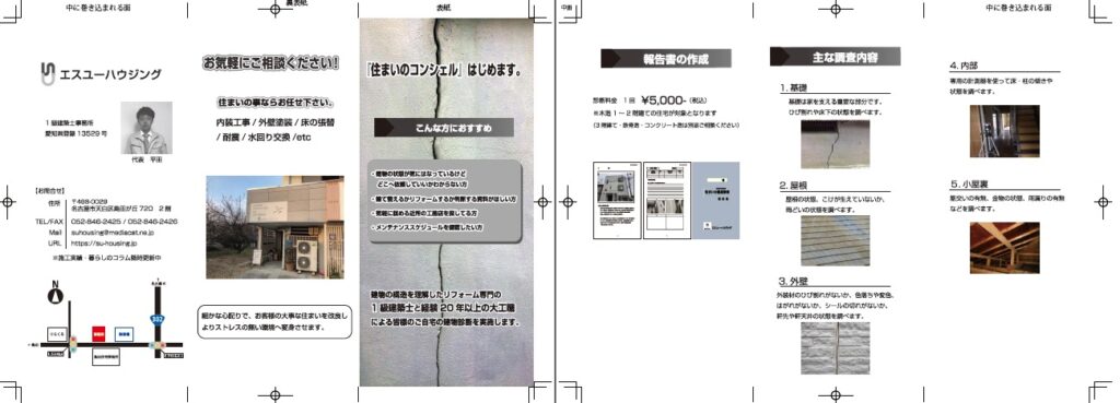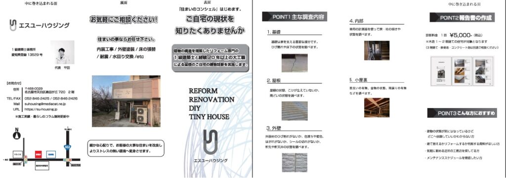 当社はリフォーム・リノベーション・DIYをコンセプトに現状の住まいの保守点検や改良をしているため、皆様のご自宅の建物調査の実施する内容にしています。