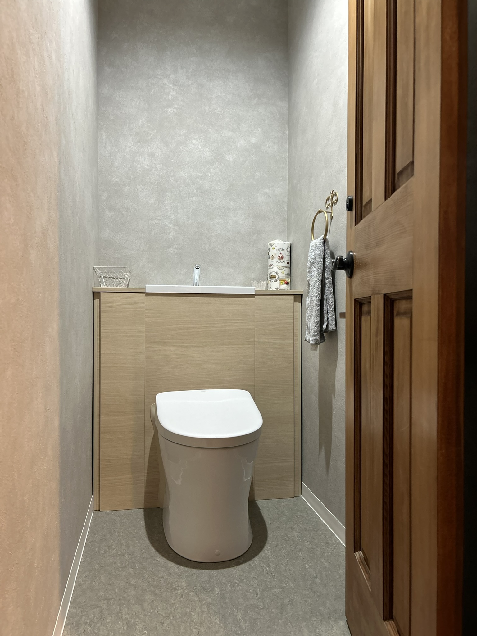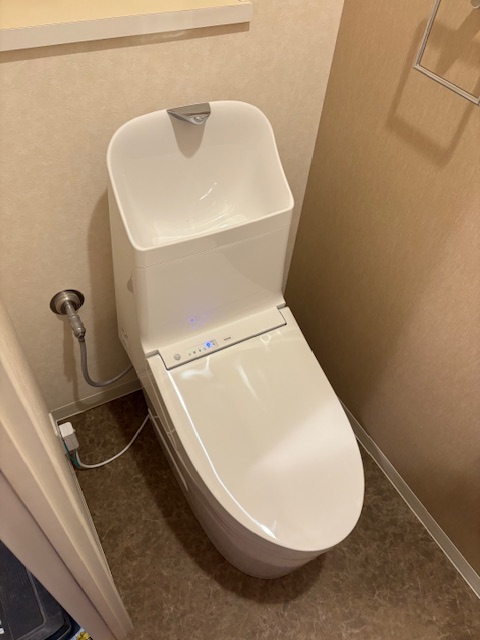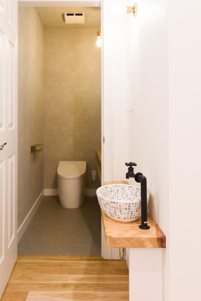 従来型のトイレ空間を、機能性とデザイン性を兼ね備えたモダンな空間へ改装しました。床組みの補修と配管の見直しを行った上で、TOTOの「きれい除菌水」機能付き便器を導入。さらにカウンター手洗いを設置することで、使いやすさと開放感を両立した快適なトイレ空間となっています。