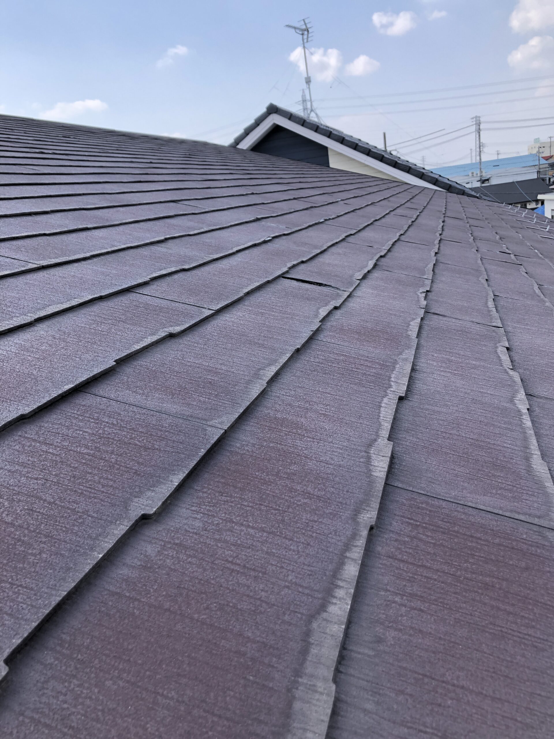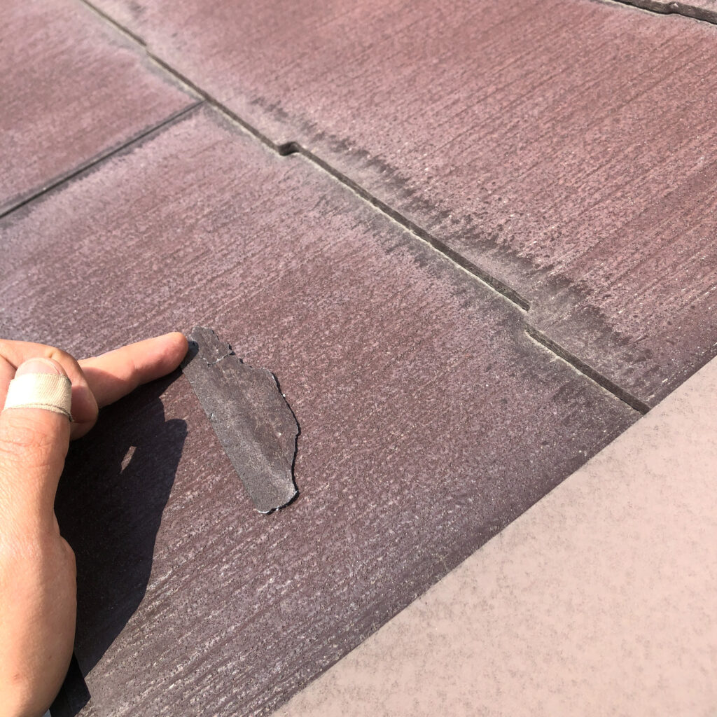 築浅の物件で屋根の塗り替えをご提案していましたが、着工前の再確認で一部に違和感があり、調査を行いました。その結果、初期のノンアスベスト商品で不具合のある材料が使用されていたため、塗り替えではなく貼替をご提案。図面上では商品名まで確認できず不安でしたが、実際に捲ってみたところやはり該当の商品が使われており、適切な対応を行うことができました