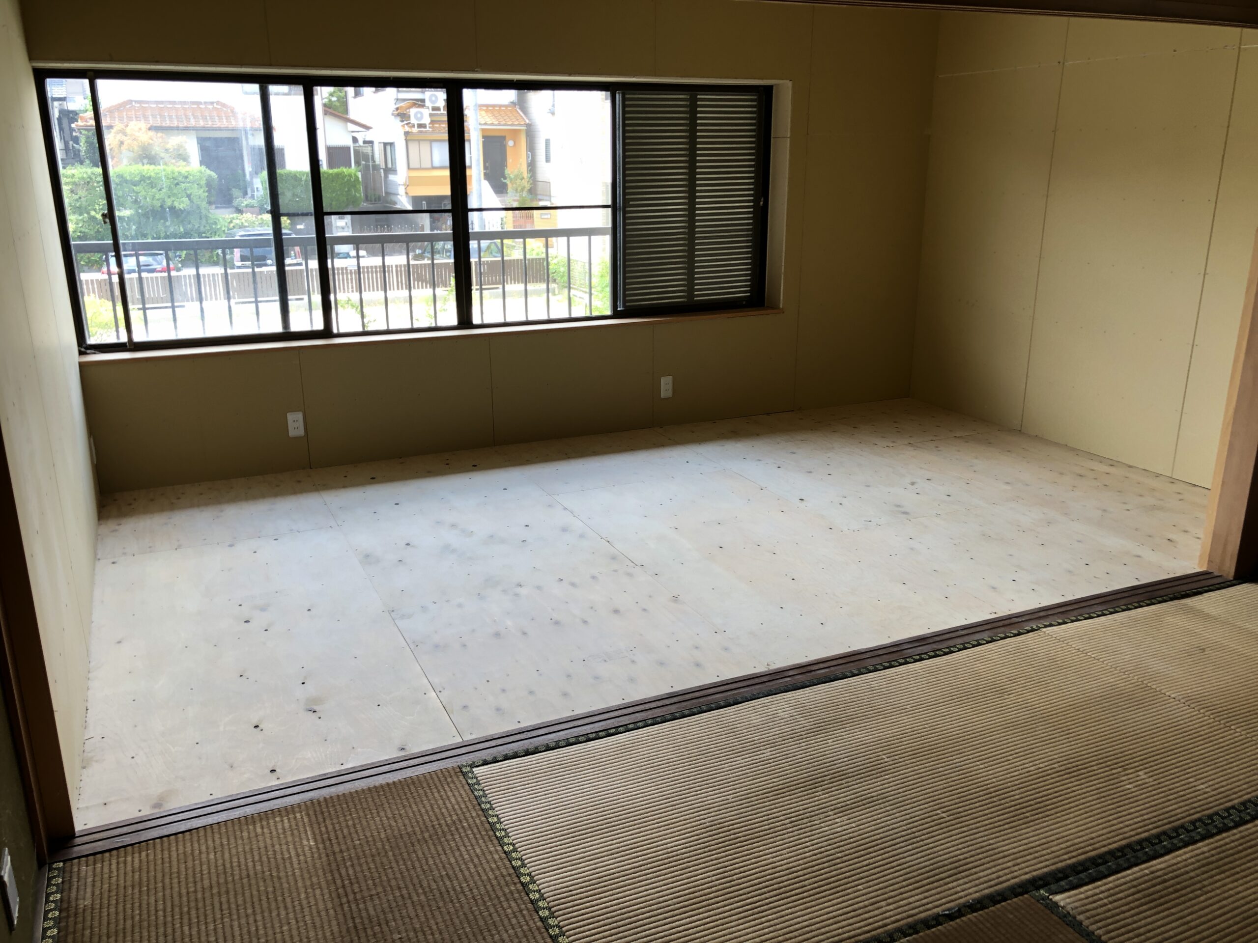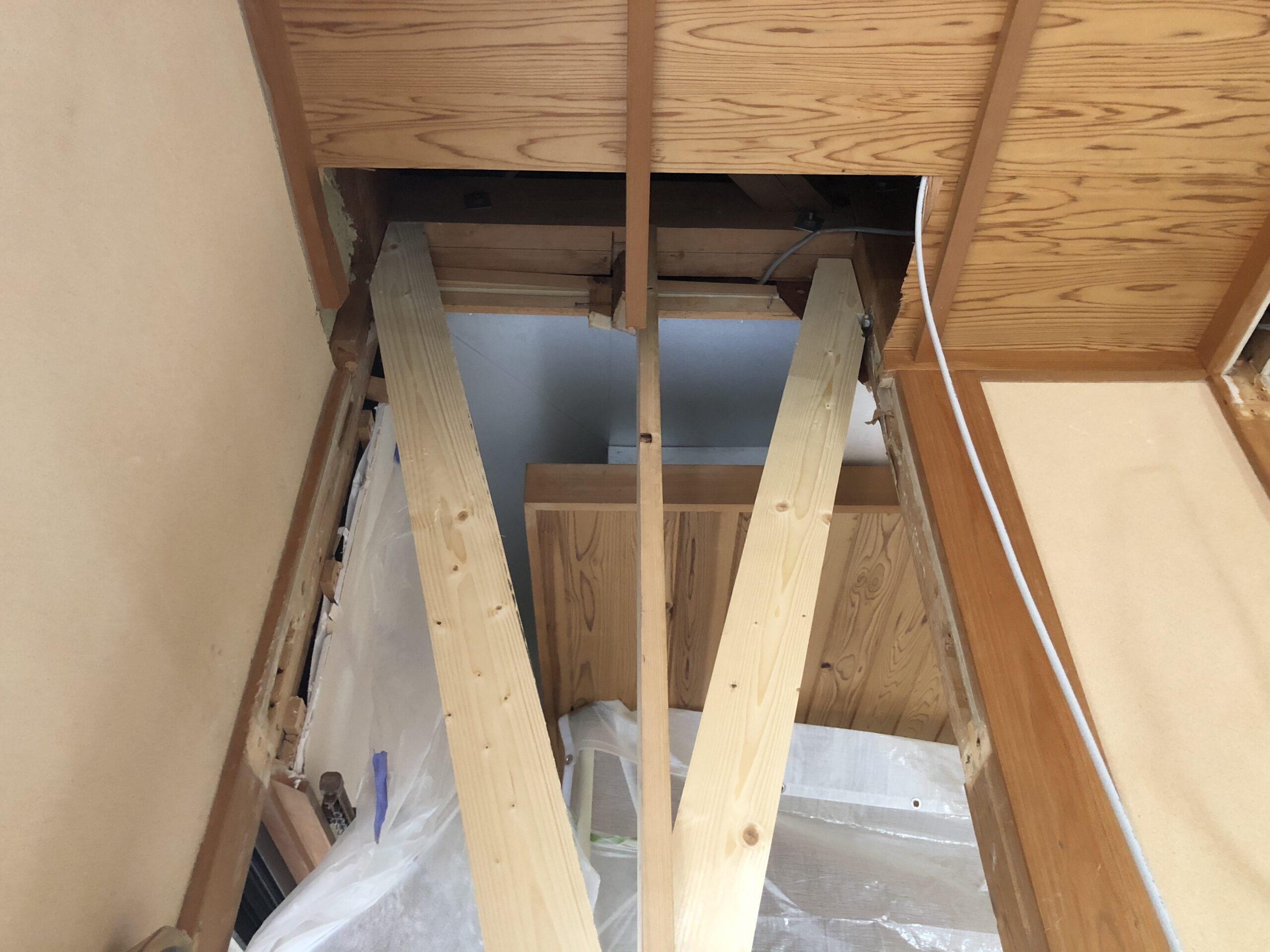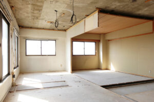 LDKの拡張に伴い、梁補強を行う計画となりました。既存の壁には筋交いがなく、床を支える柱のみでしたので、その柱を撤去し、床張りの補強を実施。補強後は安全性を確保しながらも開放感のある空間が実現し、お客様にも大変ご満足いただきました