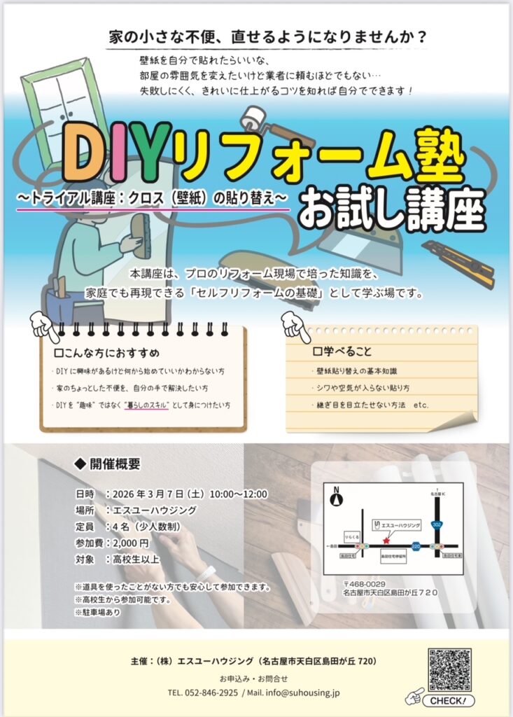 今回は第2回目としてご自宅で壁紙貼替を貼替してみたい方必見のDIY講座を開催いたします
